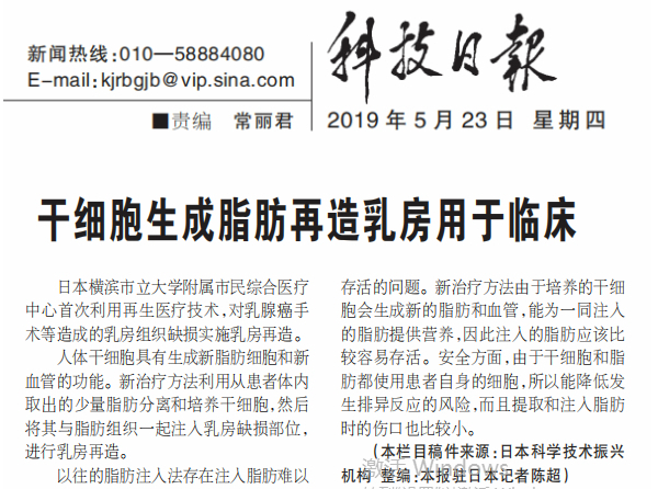日本橫濱市立大學(xué)附屬市民綜合醫(yī)療中心首次利用再生醫(yī)療技術(shù),對乳腺癌手術(shù)等造成的乳房組織缺損實施乳房再造。人體干細胞具有生…