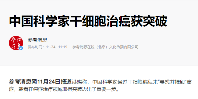 參考消息網(wǎng)11月24日報道港媒稱,中國科學家通過干細胞編程來“尋找并摧毀”癌癥,朝著在癌癥治療領域取得突破邁出了重要一步。據(jù)…