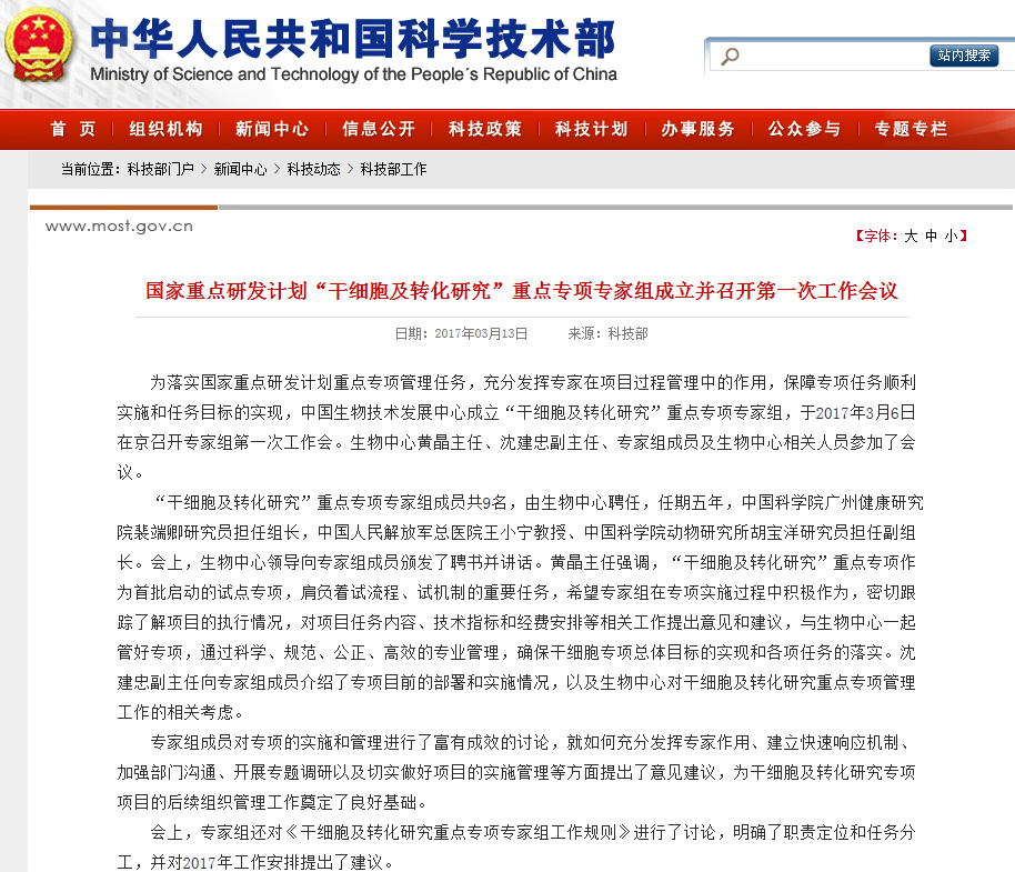 國(guó)家重點(diǎn)研發(fā)計(jì)劃“干細(xì)胞及轉(zhuǎn)化研究”重點(diǎn)專項(xiàng)專家組成立并公告…